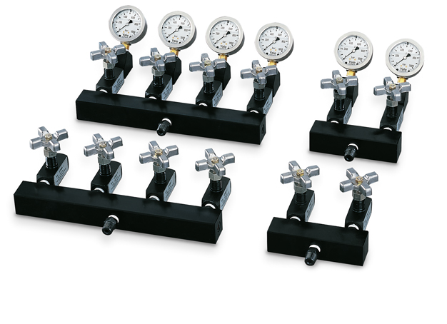 Mit diesen Verteiler lassen sich die angeschlossenen Zylinder gegeneinander absperren, so dass auch ungleiche Lasten gehoben werden können. MY-22-GYA, komplett montiert mit 4 Absperrventilen und 4 Manometersätzen. Doppelnippel 3/8"-NPT-Außengewinde zum direkten Einschrauben in den Kopf einer Handpumpe. Ausgänge der Verteiler mit 3/8"-NPT-Innengwinde zum direkten Einschrauben von Schläuchen oder Kupplungen.